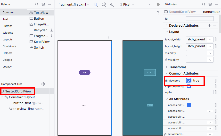 Next, set the NestedScrollView to take up the whole screen by setting “fillViewport” to true: