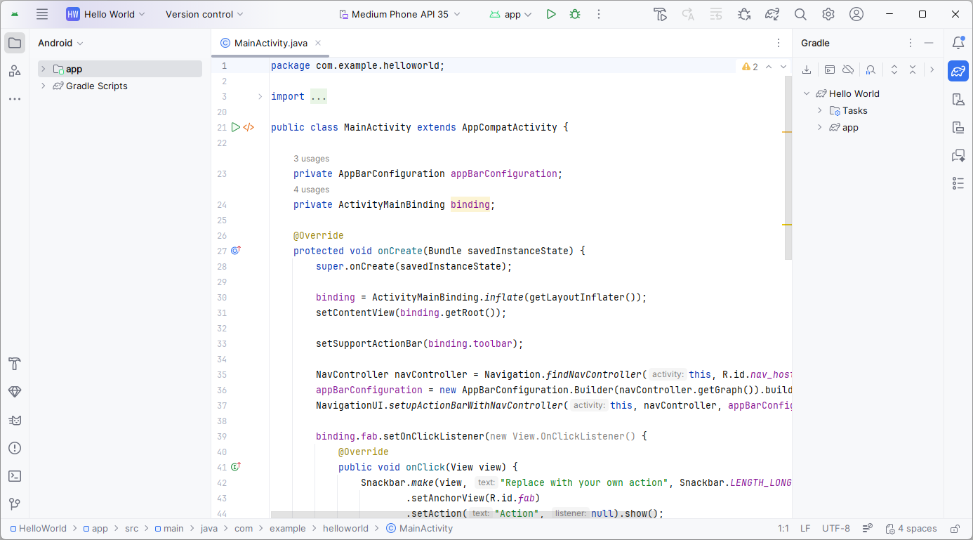 Switch to FirstFragment.java. You can also find it in the Project Structure under app, java, com.example.helloworld (your package name might be different).