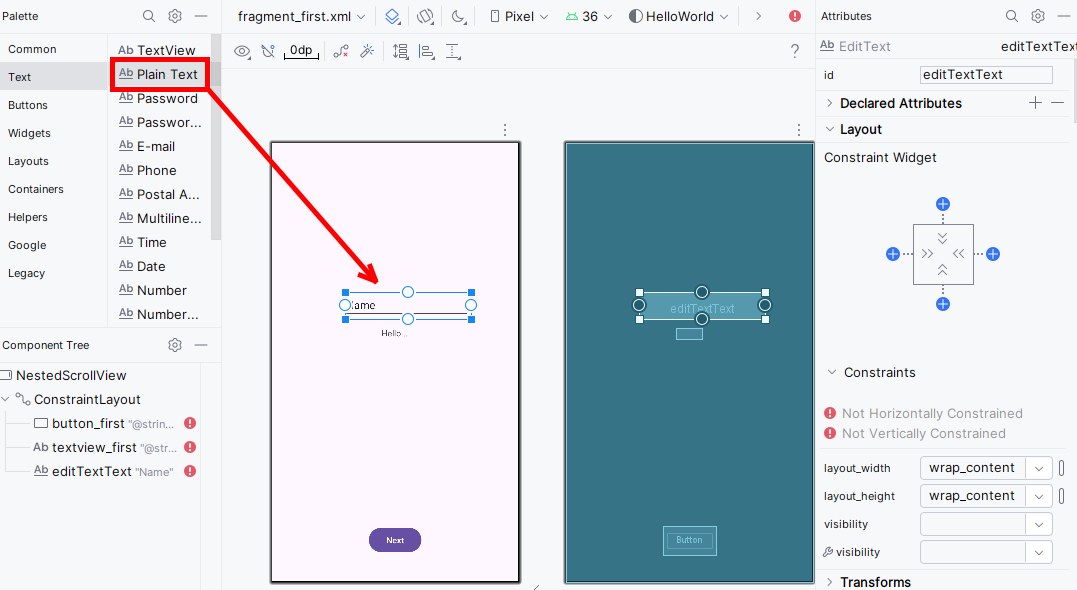 Also align the ‘Hello first fragment’ text to the left side of the textfield (drag its left-constraint circle to the left of the textfield above it):