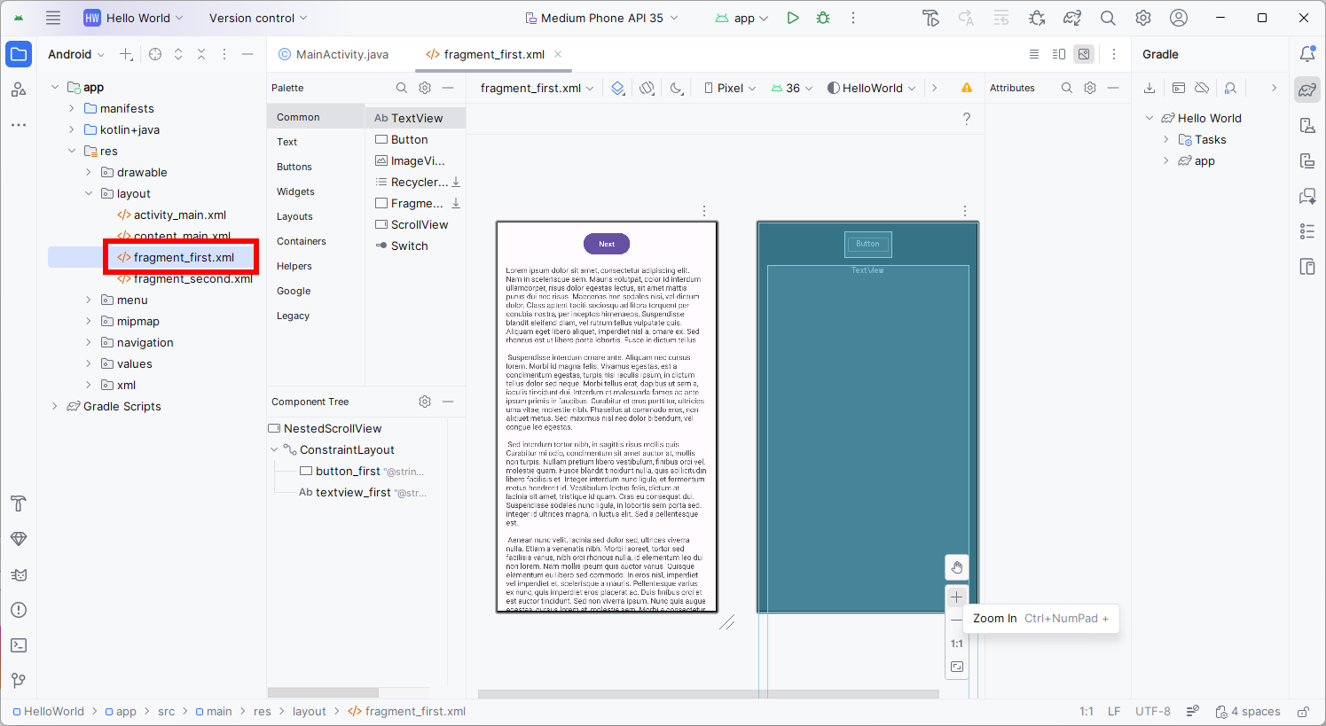 The userinterface already contains a button and a TextView with some Lorem Ipsum text. You might need to use the Zoom button in the lower right corner of the view to get the same view as above.